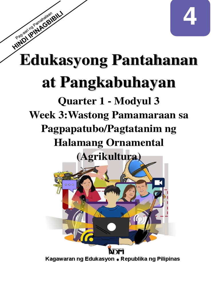 Palamuti o pampapaganda ng lugar. Ito ang pambansang bulaklak ng Pilipinas at karaniwan itong nakikitang pansabit sa mga santo at rebulto. Anamumulaklak 1halamang palumpong-halamang may matitigas na sanga gumamela adelfarosal 2halamang baging-halamang gumagapang kampanilya niyug-niyoganhasmin 3halamang bulaklakin-itanatanim dahil sa kanilang makukulay na bulaklakna may malambot na sanga begoniakamya.