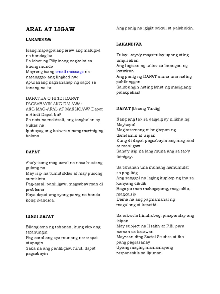 Ngayong buwan ng Pebrero Kaya tungkol sa pag-ibig ang may panalig sa Naglalang Ligaya nga ba ng anak kung sa ama ay. Payo ng magulang ating isaisip. Jinnah College for Women Mazang Lahore.