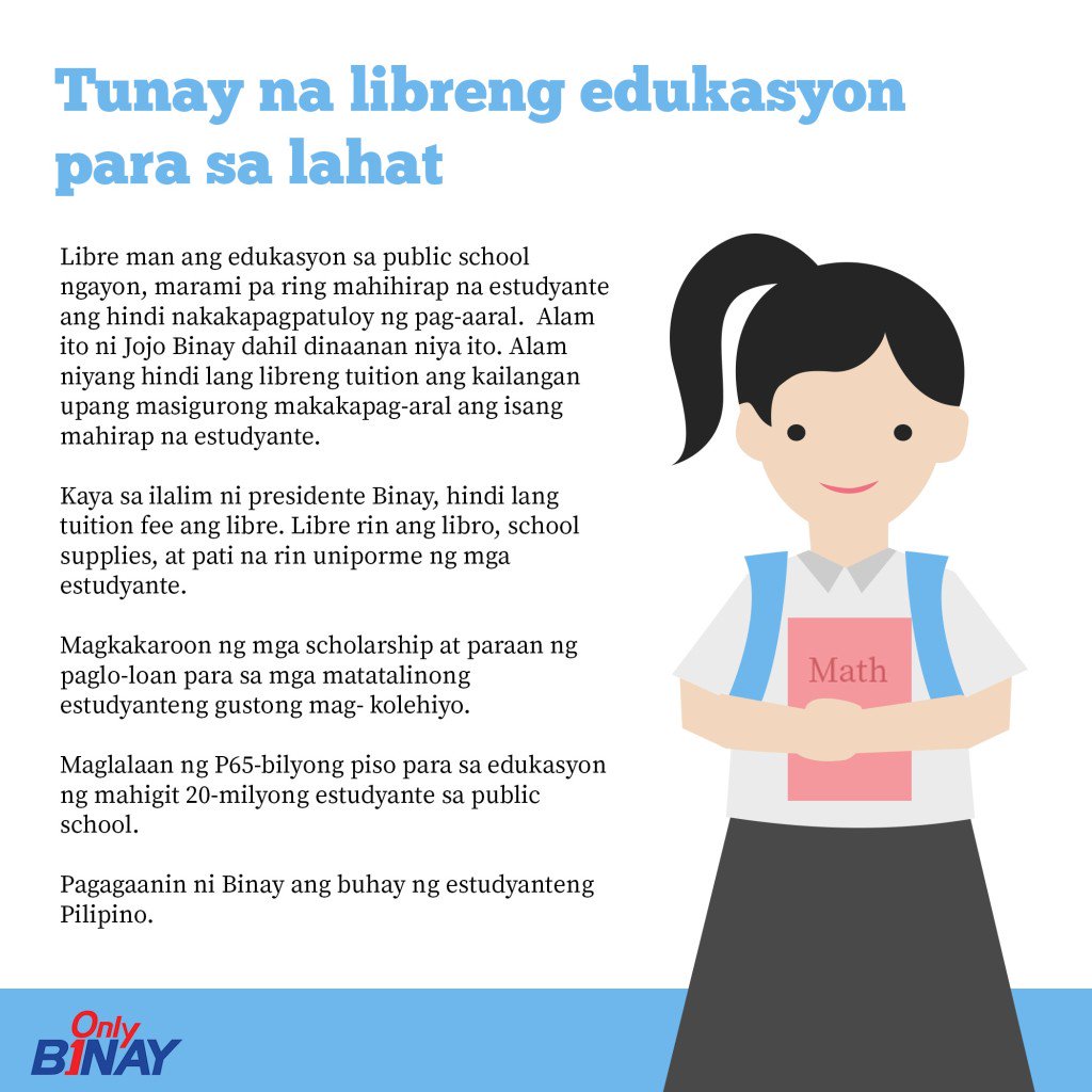 Hindi mo na kailangan ng ibang tao para magkusa ka. Edukasyon para sa lahat ng Pilipino. Ang edukasyon ay karapatan ng bawat Filipino na aniya pa hindi dapat maging hadlang ang kahirapan para sa pagpasok sa paaralan upang mag-aral at para makamit ang mga pangarap.