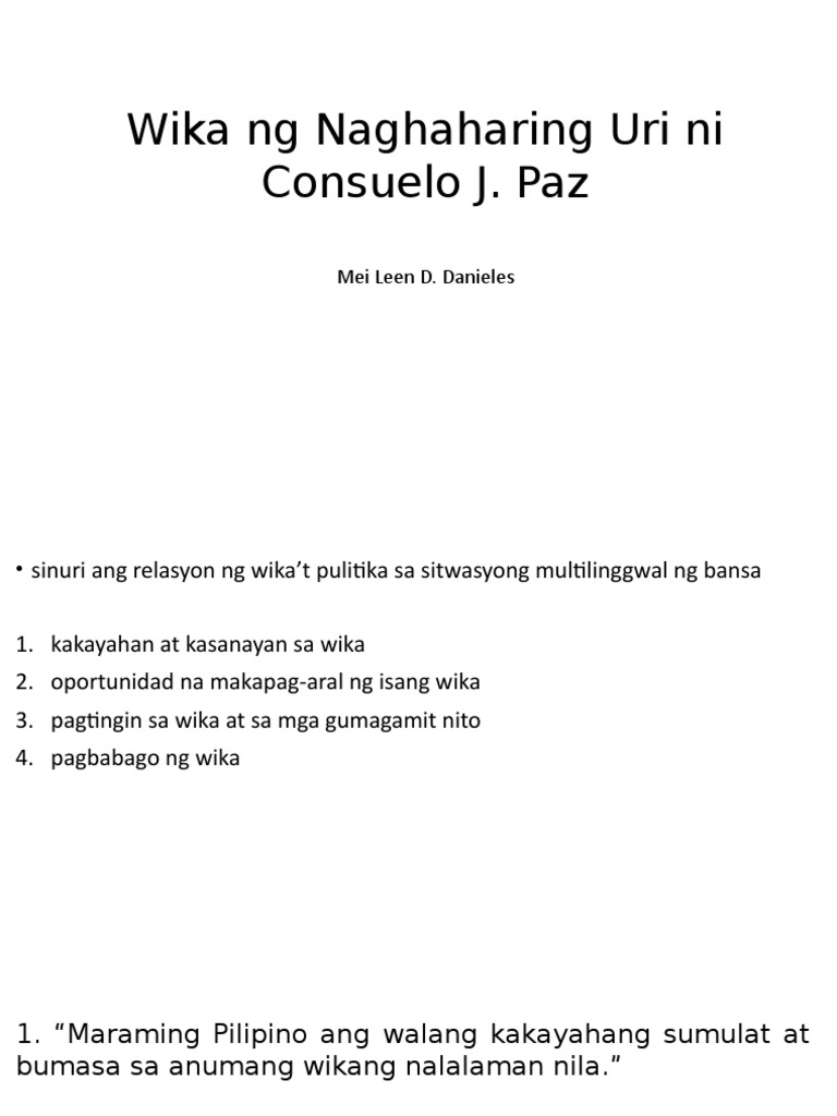May walong uri ng barayti ng wika. Ibat ibang uri ng wika. Dahil itoy wika ng karamihang tao magagamit ito sa makabayang pagbabago Wika ng Naghaharing Uri ni Consuelo J.